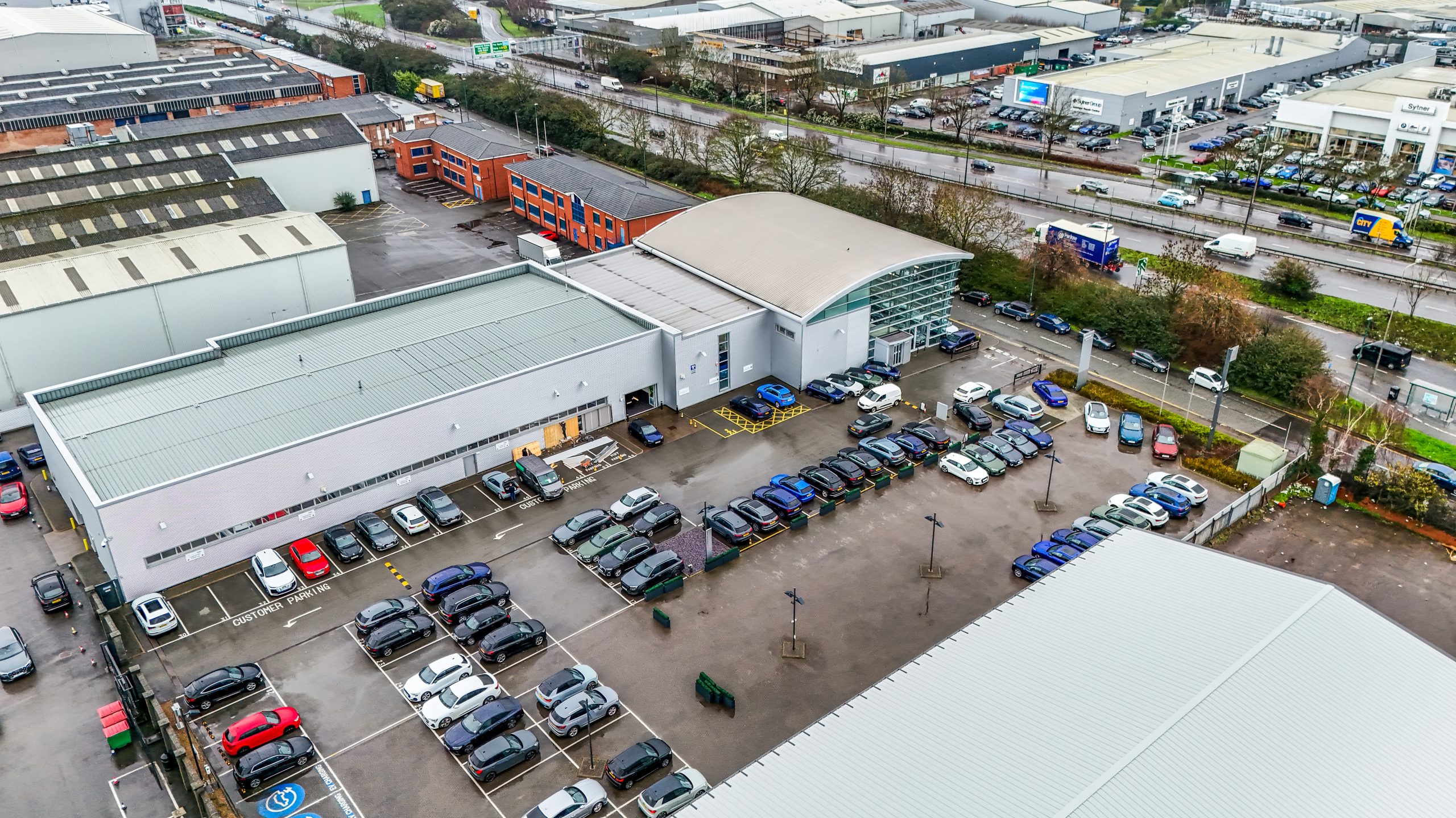 Aerial view of a large industrial complex with multiple buildings and parking areas, surrounded by residential areas and roads.